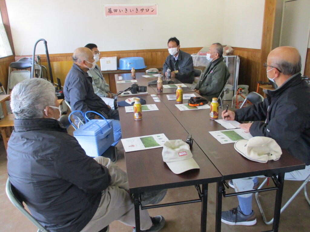 ・山に入る前に、きのこ館(集会所)にて、まつたけ再生のいきさつ、実情等について資料内容を交えdiscussした。